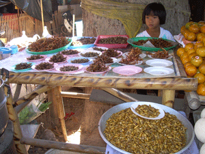 เเหล่าแมลงที่เราพูดถึงคือแมลงกินได้ที่ทอดขายเรียงรายในซุ่มริมทาง อุบลราชธานีขศรีษะเกษภายใต้ร่มเงาของยางนาต้นใหญ่มีซุ้มขายสินค้า พื้นเมืองเรียงรายสองข้างทาง ต้นยางกลายเป็นสัญลักษณ์ของตลาดไป แล้ว สินค้ามีตั้งแต่ขนม มันพื้นเมือง มันแกว มันเทศ หมูยอ ที่ขาดไม่ได้คือ เหล่าแมลงทอด ด้วยความสนใจส่วนตัวในเรื่องแมลงทำให้ผมอดไม่ ได้ที่จะเก็บข้อมูลและบันทึกภาพ เนื่องจากแมลงเป็นอาหารสำคัญของคน ในถิ่นนี้ แม้จะไม่ใช้อาหารหลัก แต่ก็จัดเป็นอาหารขบเคี้ยวประเภท snack food ที่มีประโยชน์ไม่น้อยอาหารเหล่านี้สะท้ออนไปถึงรากเหง้า วัฒนธรรมและการเรียนรู้ธรรมชาติวิทยา ของชุมชน โดยเฉพาะเด็ก ๆ ได้สนุกกับการเก็บแมลง ไล่ล่า ค้นหาแมลง สนุกกับการวิ่งเล่นไปพร้อม ๆ กัน แมลงที่จับมาได้นำมาขายก็เป็นรายได้เป็นอีกแนวทางหนึ่งในการ ลดศัตรูธรรมชาติของพืช ส่วนหนอนไหมนั้นต้องนั่งเฝ้ารอคอยกว่า จะสาวไหมออกจาก ตัวหนอน ต้องเลี้ยงตัวหนอนก่อนจะได้กิน ทำให้เห็น กระบวนการเกิดไหม กลายเป็นผ้าไหมผืนงาม เหล่านี้ล้วนมีกลิ่นอาย ของวิถีชุมชนและวัฒนธรรม ผมเห็นหลายคนแสดงอาการรังเกียจแมลง และทำหน้าเหยเกเมื่อถูกชักชวนให ้ชิมแมลงทำให้ผมเห็นความไม่เข้าใจ ในสาระของคนเหล่านี้ ของดี ๆ ไม่จำเป็นต้องสวยงาม และของแปลก ก็ไม่ใช่ของไม่ดีเสียหน่อย เหตุใดต้องทำท่าทำทางรังเกียจถึงเพียงนั้น มนุษย์ผู้ซึ่งกินเนื้อ ล้มวัวตัวใหญ่นั้น น่ารังเกียจกว่าหลายเท่า บทสรุปของการเดินทาง ด้วยการเดินทางที่เต็มไปด้วยเหตุผล ทำให้เรา ได้สังเกตและเรียนรู้ธรรมชาติและวัฒนธรรมไปพร้อมกัน งานแต่งงาน สะท้อนความเป็นอัตลักษณ์ของชุมชนเช่นเดียวกับอาหารที่เขารับประทาน